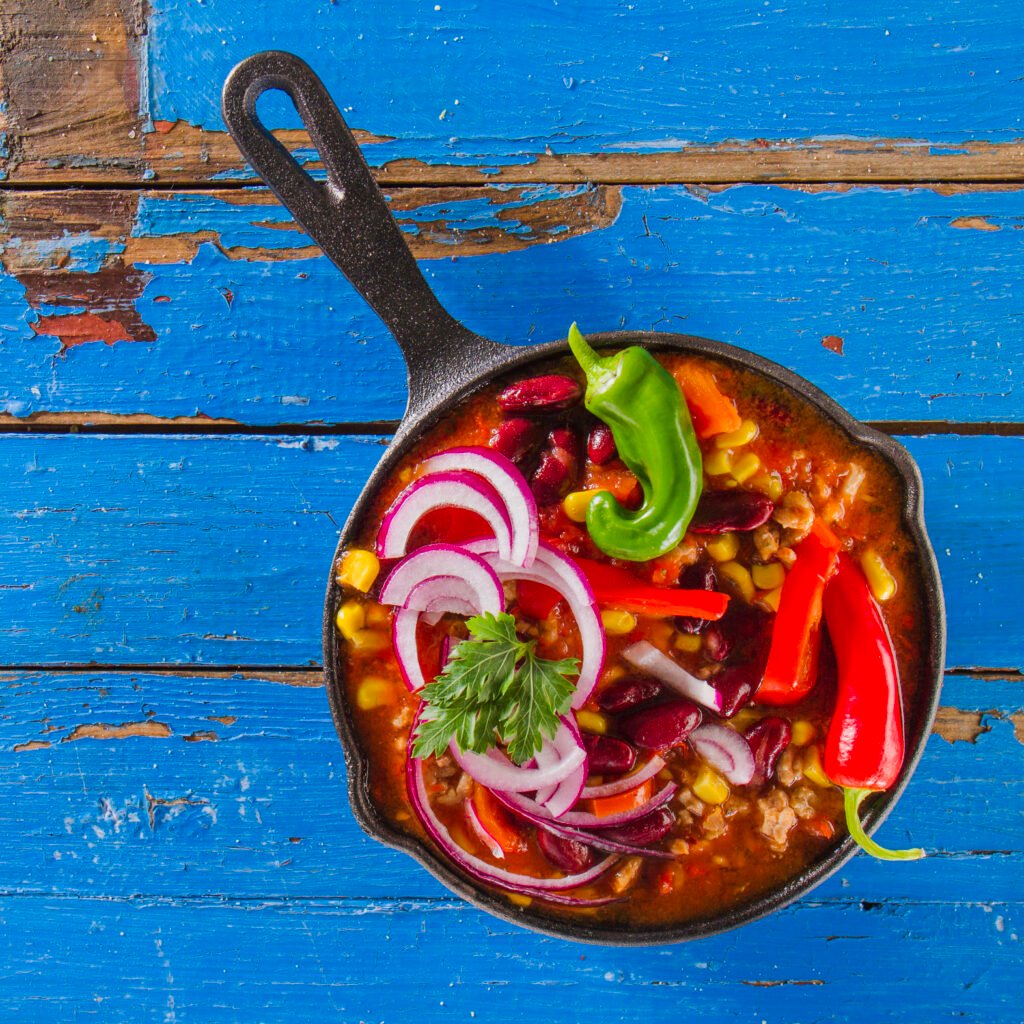 Le nom « chili con carne » signifie littéralement « piment avec viande ». Le plat est composé de viande hachée, d’oignons, de poivrons, d’ail, de piments, de tomates et de haricots rouges, ainsi que d’une variété d’épices telles que le cumin, la coriandre et le paprika. Traditionnellement, le plat est cuit lentement dans une casserole en fonte pour permettre aux saveurs de se développer.